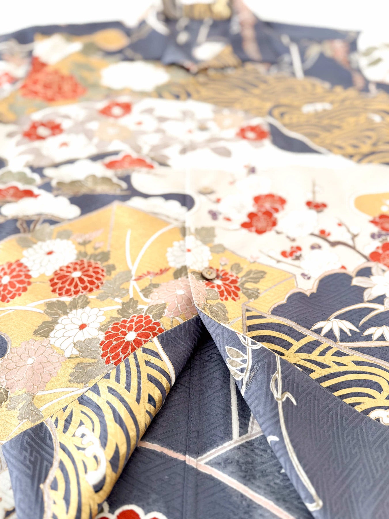 こちらの商品は元々、振袖をリメイクして「着物アロハシャツ」として仕立てました。