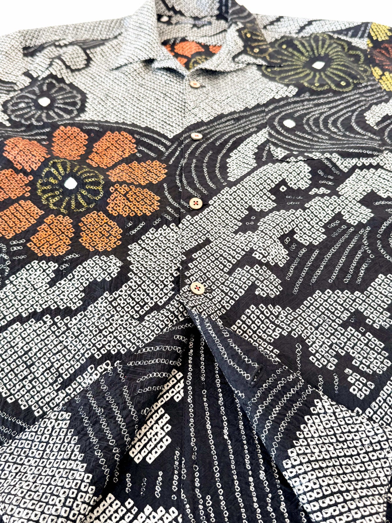 こちらの商品は元々、振袖をリメイクして「着物アロハシャツ」として仕立てました。
