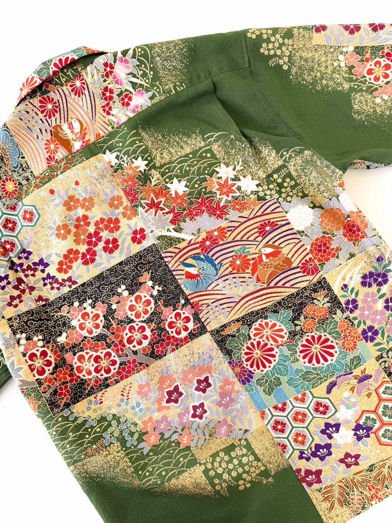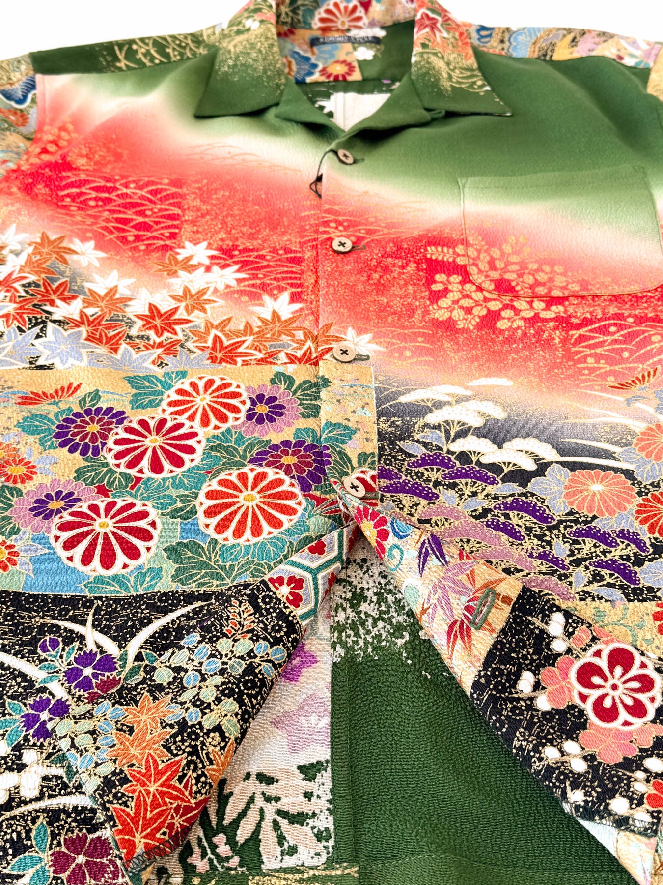 こちらの商品は元々、振袖をリメイクして「着物アロハシャツ」として仕立てました。