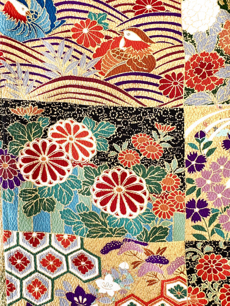 当ショップの作品は全て正絹(シルク100%)を用いておりますが、新物ではありませんので年代相応の薄ジミ・多少の焼けムラ(色落ち)、擦り傷などがある場合がございます。どうしても使用しなければならない事をご理解頂き、それを含めてのオリジナル感・ヴィンテージ感をお楽しみ頂ければ幸いです。