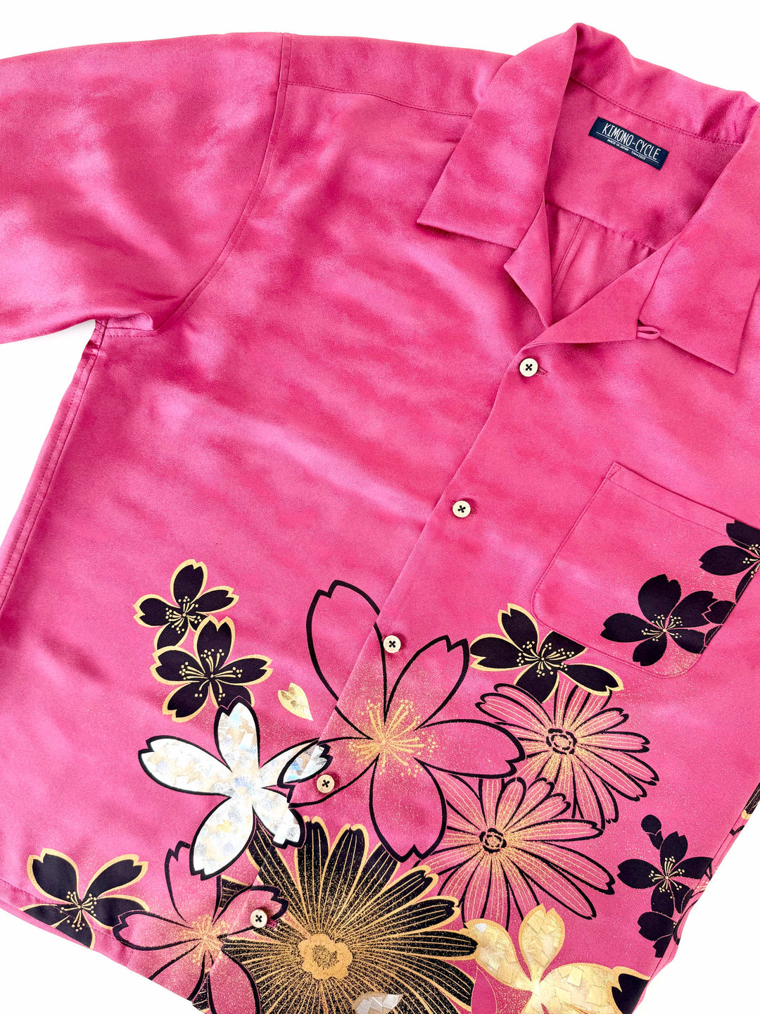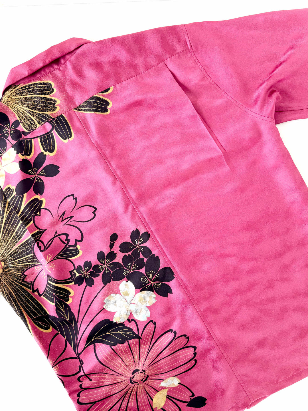 こちらの商品は元々、振袖をリメイクして「着物アロハシャツ」として仕立てました。