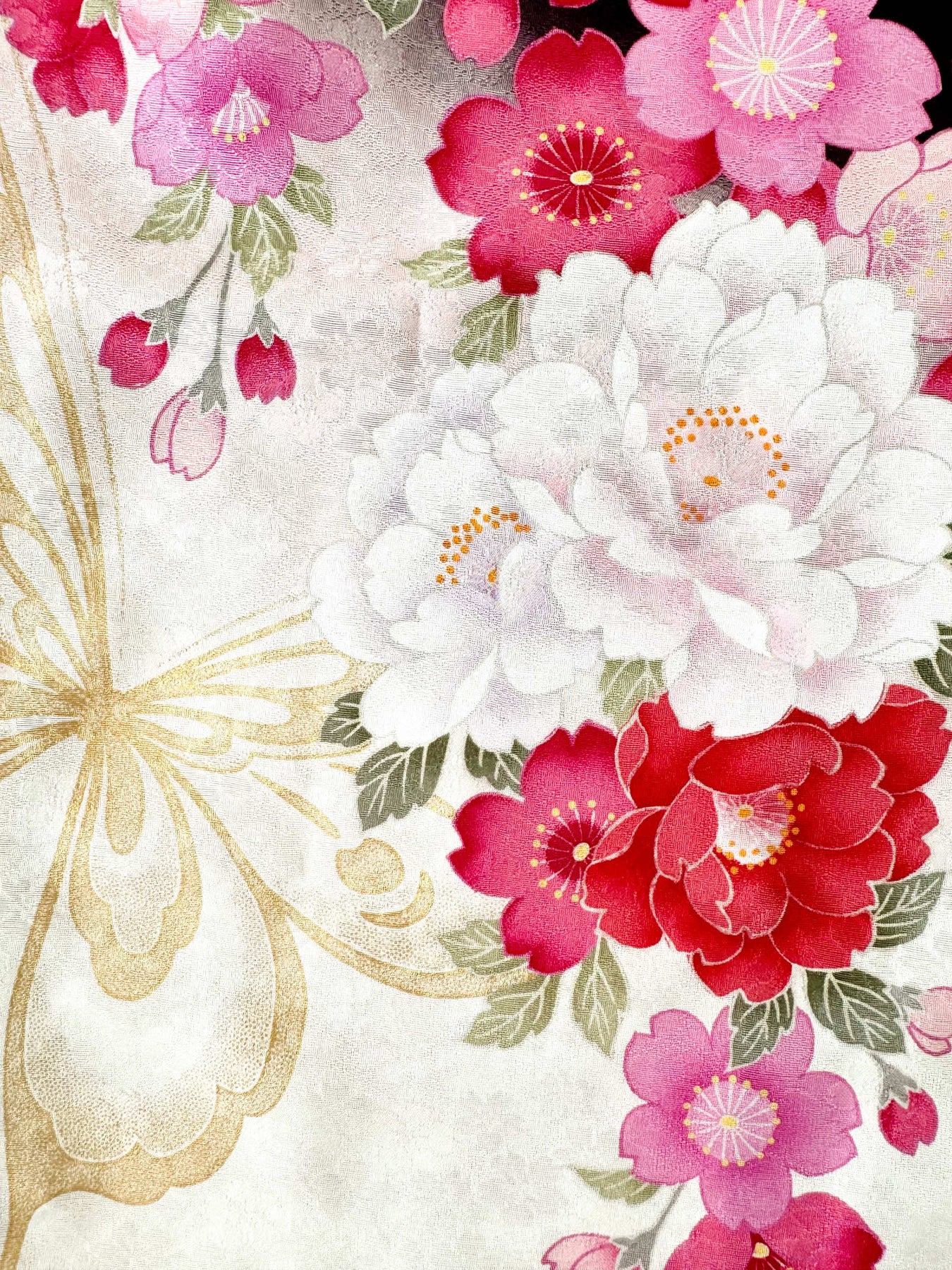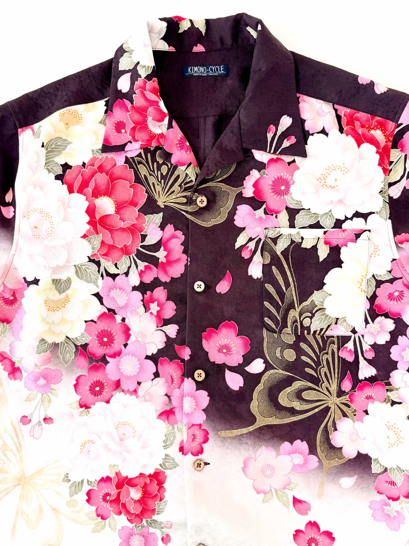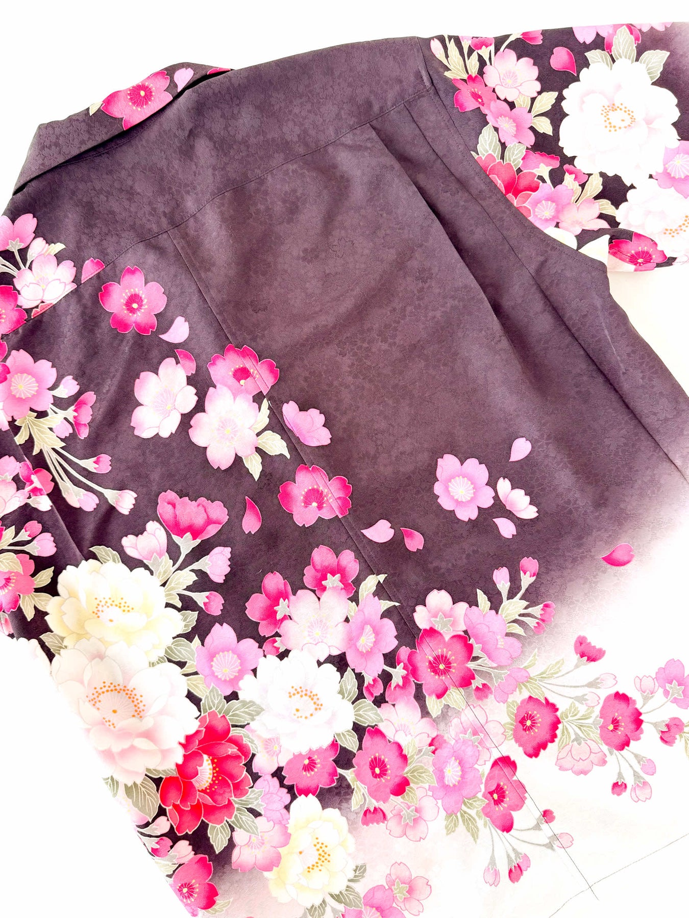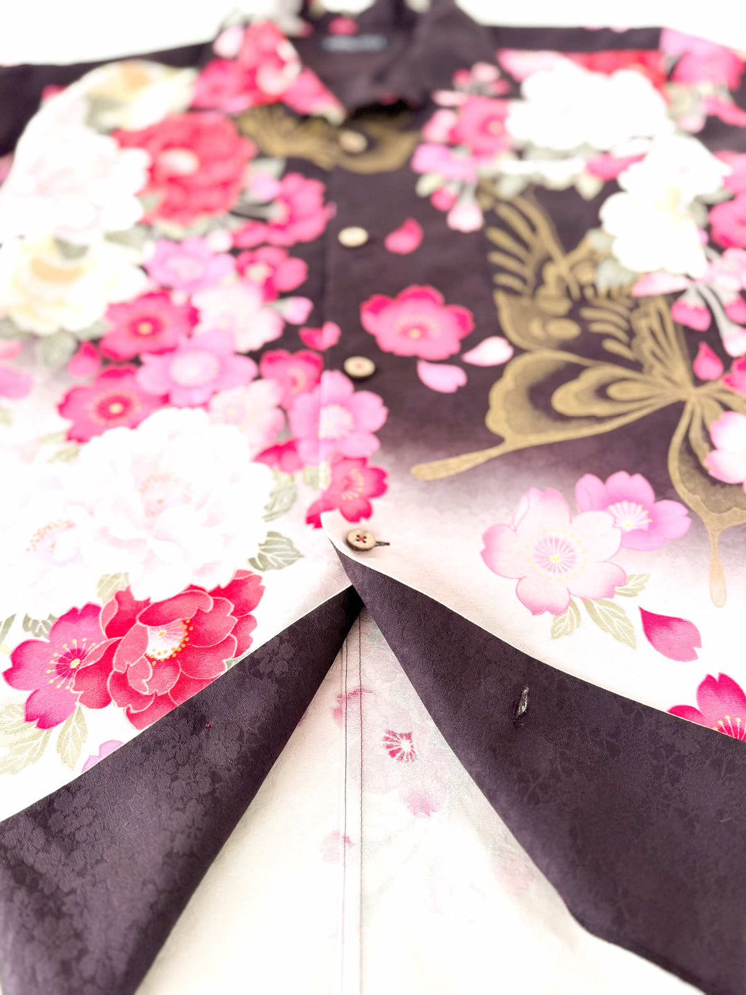 こちらの商品は元々、振袖をリメイクして「着物アロハシャツ」として仕立てました。